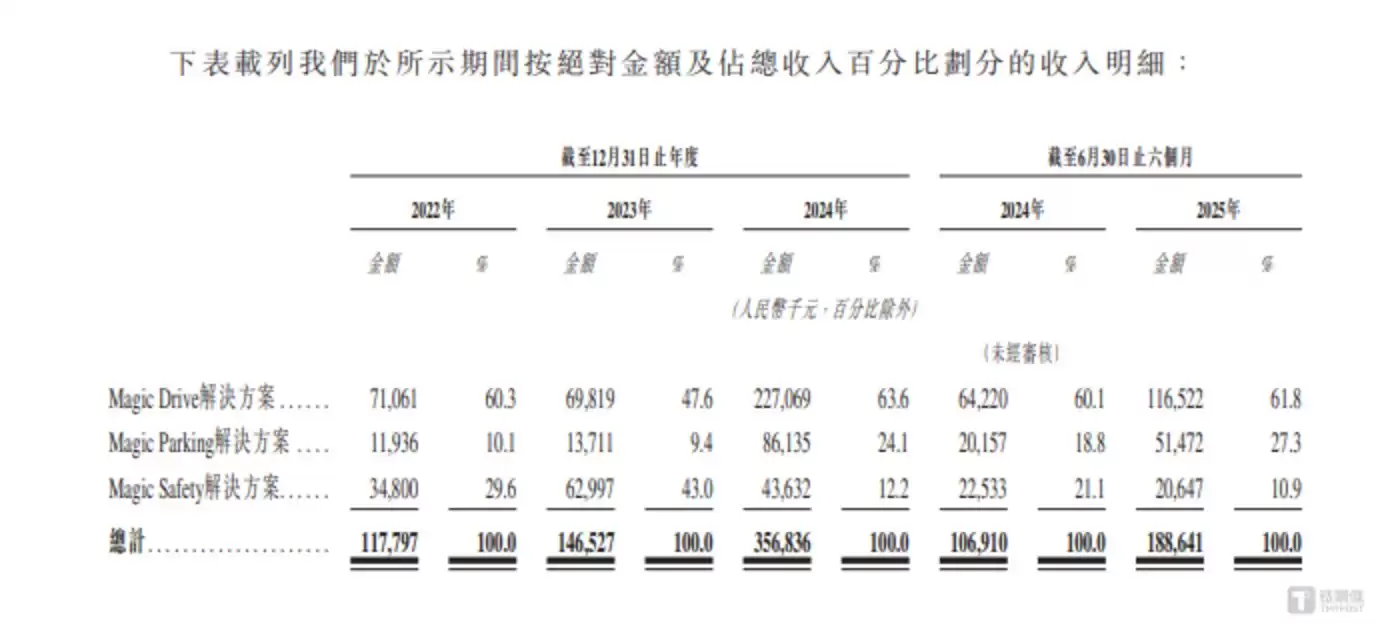 从业务布局来看,公司核心解决方案包括Magic Drive智能驾驶系统、Magic Parking自动泊车系统以及Magic Safety主动安全系统。其中Magic Drive作为创收主力,在2024年至2025年上半年的报告期内,分别贡献营收7106.1万元、6981.9万元、2.27亿元和1.17亿元,占当期总收入比重分别为60.3%、47.6%、63.6%和61.8%,始终是公司最重要的收入来源。