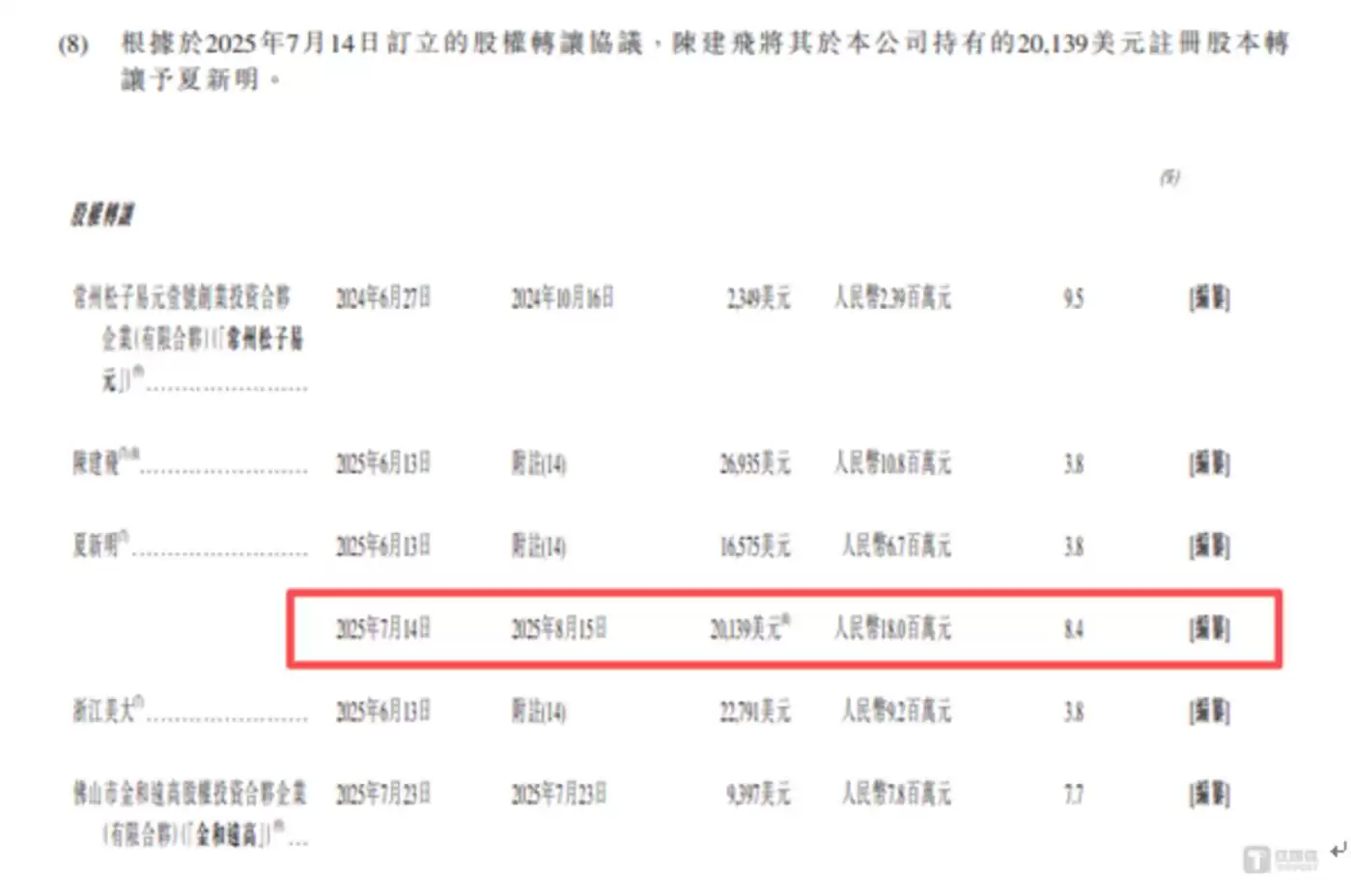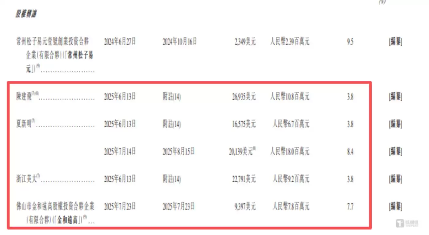 与此同时,魔视智能在同一时间段内的股权定价差异,进一步引发市场对增资价格公允性的质疑。2025年6月至7月期间,公司股权架构发生多轮变动,陈建飞、夏新明、浙江大学科技园、金和远高等主体通过股权转让方式获得股权时,价格区间为3.8元/股至8.4元/股,具体情况如下: