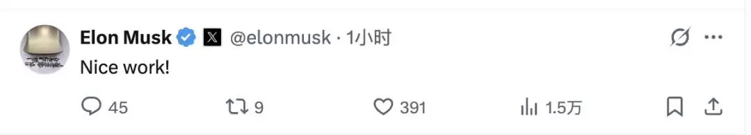 马斯克也对这份成绩表示祝贺,在社交媒体上称赞了一句“Nice work”。