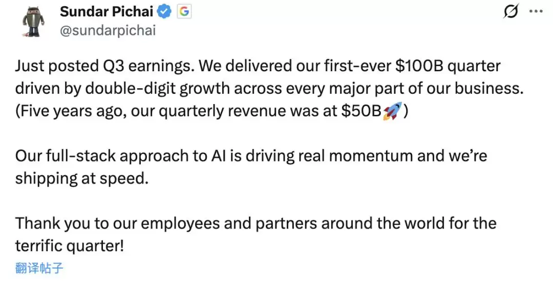 谷歌CEO桑达尔·皮查伊(劈柴哥)激动地公布了这一业绩,并表示公司采用的全栈式AI战略有力推动了增长势头。
