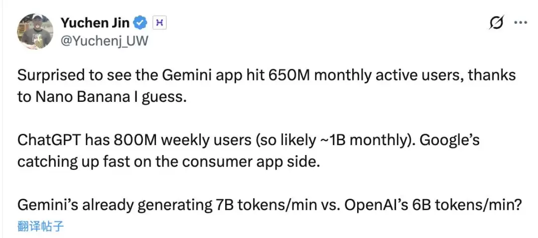 随着Nano Banana的爆火,Gemini应用的月活跃用户数已攀升至6.5亿。