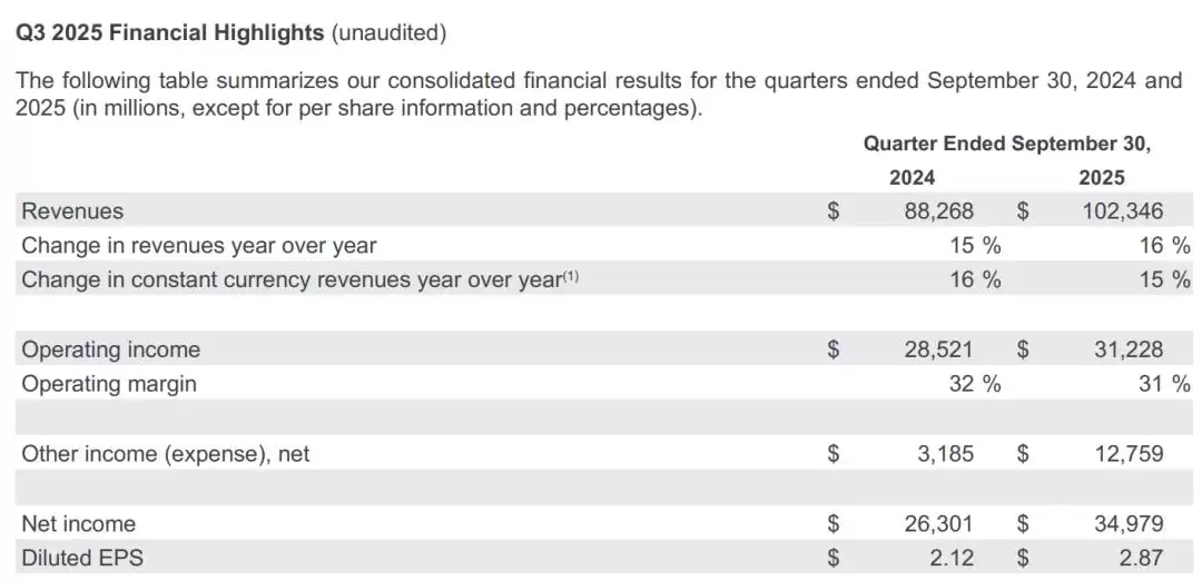 净利润达到349.8亿美元,较去年同期大幅增长33%。其中,营业利润为312亿美元,营业利润率达30.5%,每股收益(EPS)为2.87美元,同比攀升35%。
