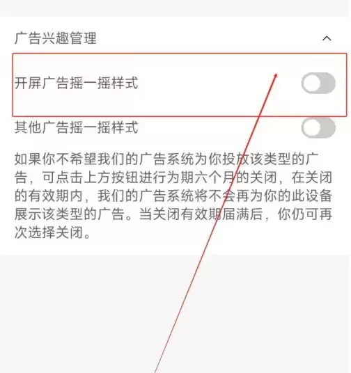 在新界面中找到"开屏广告摇一摇样式",点击右侧按钮。当按钮颜色变为灰色时,表示已成功关闭该功能