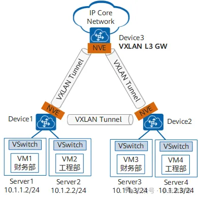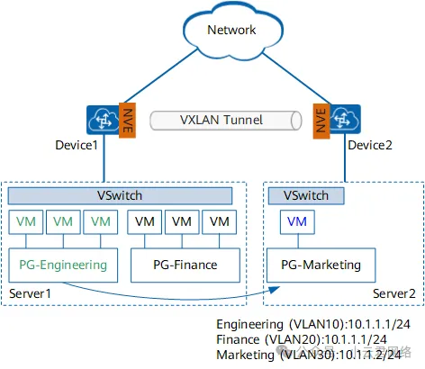 为实现工程部门向Server2的成功迁移,可通过VXLAN技术实现。VXLAN作为基于MAC in UDP的网络虚拟化技术,只要底层物理网络支持IP转发,即可构建跨越物理边界的大规模二层网络。