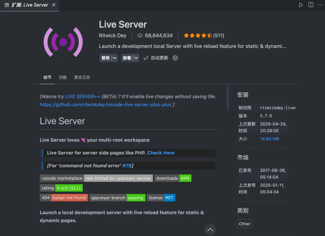只需点击右下角的"Go Live",静态页面就能直接跑在本地服务器上,保存即刷新,手机连同一局域网也能访问,调试响应式页面简直方便到飞起。