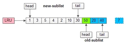 整个LRU长度是10;前70%是新生代;后30%是老生代;新老生代首尾相连。