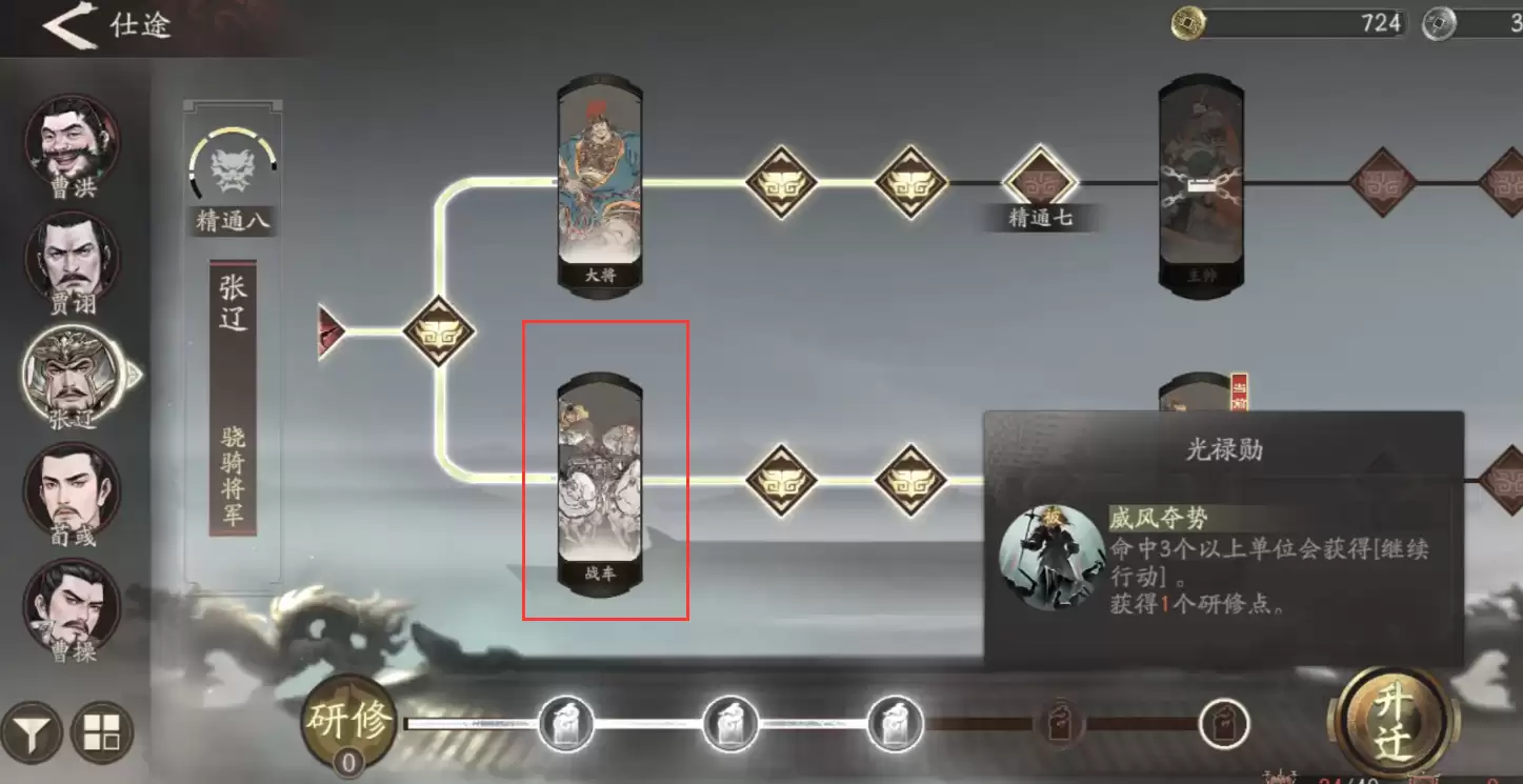 统帅类型的武将,比如曹操,在转职选择上应该侧重于团队增益效果,因此推荐选择“群雄”路线。转职后,射程范围会变得更广,对人移动的距离也会缩短,从而更好发挥大范围增益效果。
