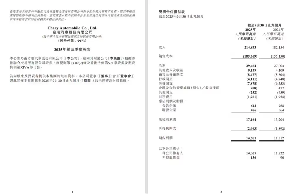 奇瑞前三季度营收2148.33亿元,净利润143.65亿元
