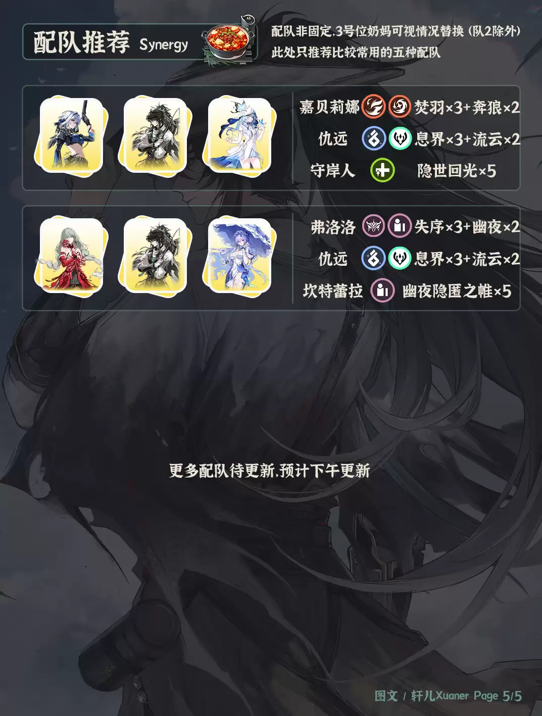 ⑤仇远当前主要与嘉贝莉娜组队,其次可以考虑弗洛洛队替代洛可可。其他配队方案还有待后续版本更新。