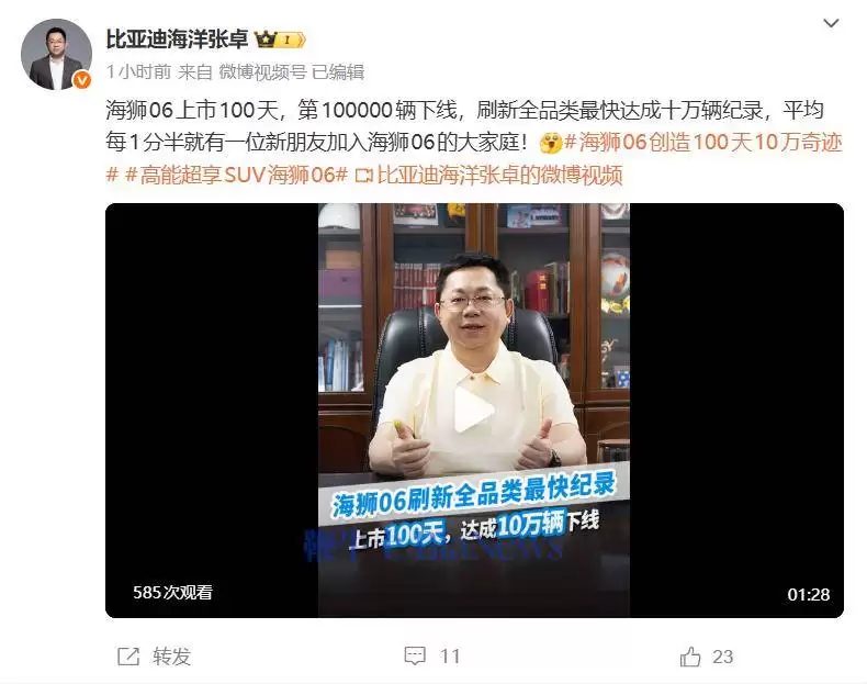 比亚迪海洋网销售事业部总经理张卓近日通过社交媒体平台宣布,海狮06车型上市仅100天便迎来第10万辆整车下线,创下全品类车型最快达成这一里程碑的纪录。据统计,这款车型以平均每1分30秒新增一位用户的速度持续刷新市场热度,销量表现节节攀升。