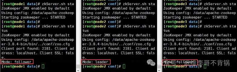 确认3台机器都正常启动,其中两台为follower,一台为leader,则ZooKeeper集群安装成功。