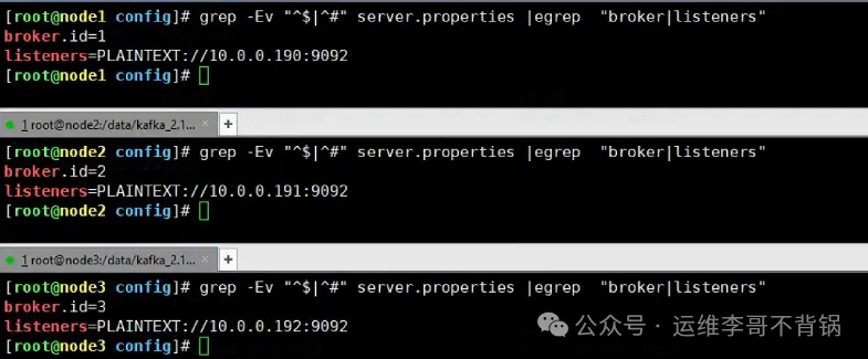 注意:节点2和节点3需要修改broker.id和listeners两个配置