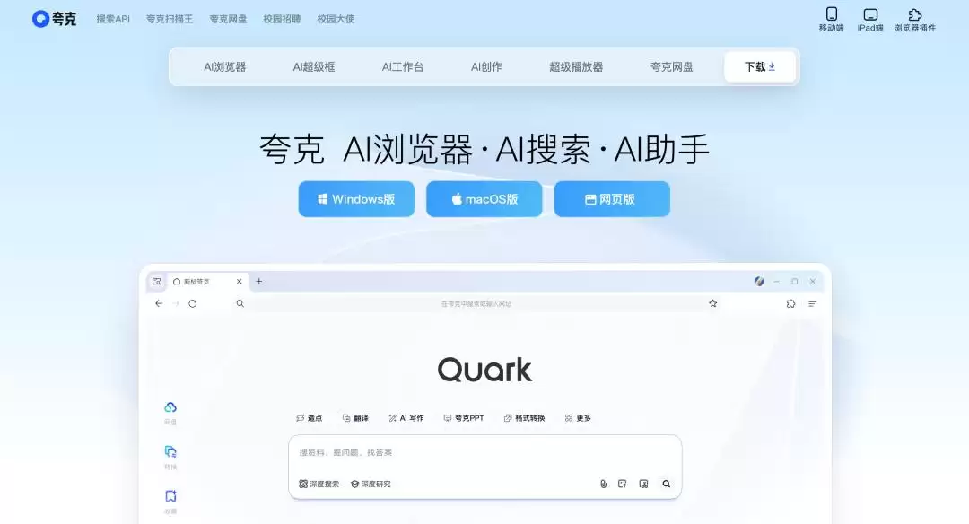 长期以来,夸克更多像阿里体系里的一条支线:做浏览器、做搜索框、做网盘 、 做办公学习集合 不一而足,可以说哪里需要就出现在哪里,算是一种难得的工具理想主义。