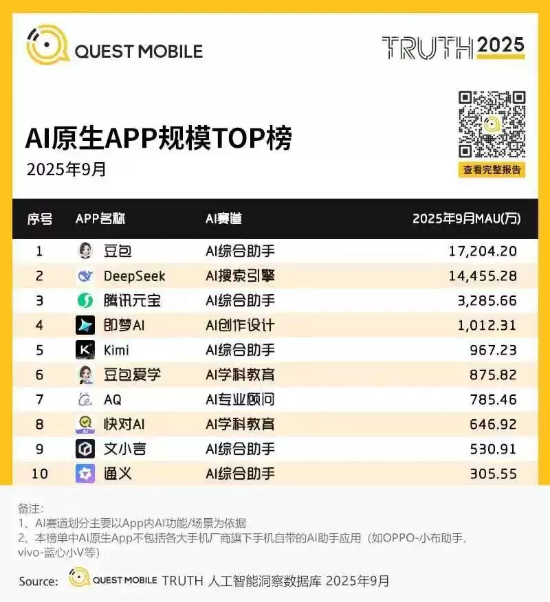 毕竟如果去看QuestMobile的报告,AI原生APP规模TOP榜里通义还能排在第十位,但根本就没有夸克的身影。豆包和Deepseek的月活已经直奔两亿而去,腾讯今年不断力推的元宝,目前月活用户也不过才3000万出头。