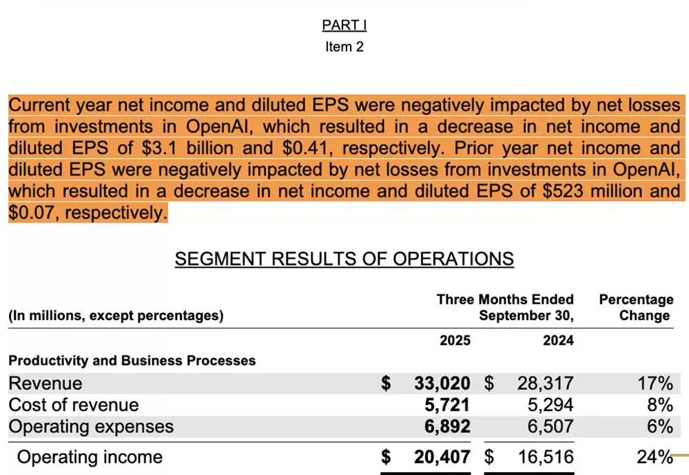 本年度净利润和摊薄后每股收益受到对OpenAI投资净亏损的负面影响,分别导致净利润和摊薄后每股收益减少31亿美元和0.41美元。上年度净利润和摊薄后每股收益也受到对OpenAI投资净亏损的负面影响,分别导致净利润和摊薄后每股收益减少5.23亿美元和0.07美元。