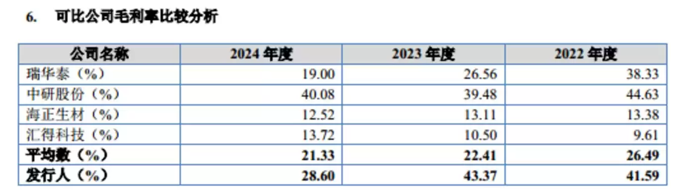不过,即便2024年毛利率大幅收缩,聚仁新材料的毛利率水平仍保持着行业优势。据公司申报稿披露,其选取的可比同行公司分别为瑞华泰、中研股份、海正生材、汇得科技,上述4家公司毛利率的平均值分别为26.49%、43.37%、28.6%,从数据对比来看,聚仁新材料各期毛利率均显著高于同行均值,即便在2024年毛利率大幅下滑后,仍比同行均值高出7.27个百分点。