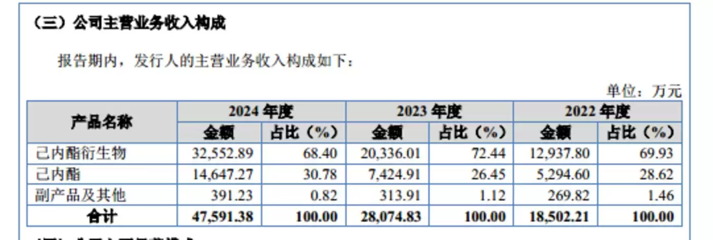 不过,这一业绩增长的背后与公司采取的降价策略密切相关。从业务结构来看,聚仁新材料主要拥有己内酰胺衍生物、己内酰胺、副产品及其他,其中报告期内己内酰胺衍生物产生的销售收入分别为12937.8万元、20336.01万元、32552.89万元,分别占当期主营业务收入的69.93%、72.44%、68.4%,是公司最重要的业务板块,具体情况如下: