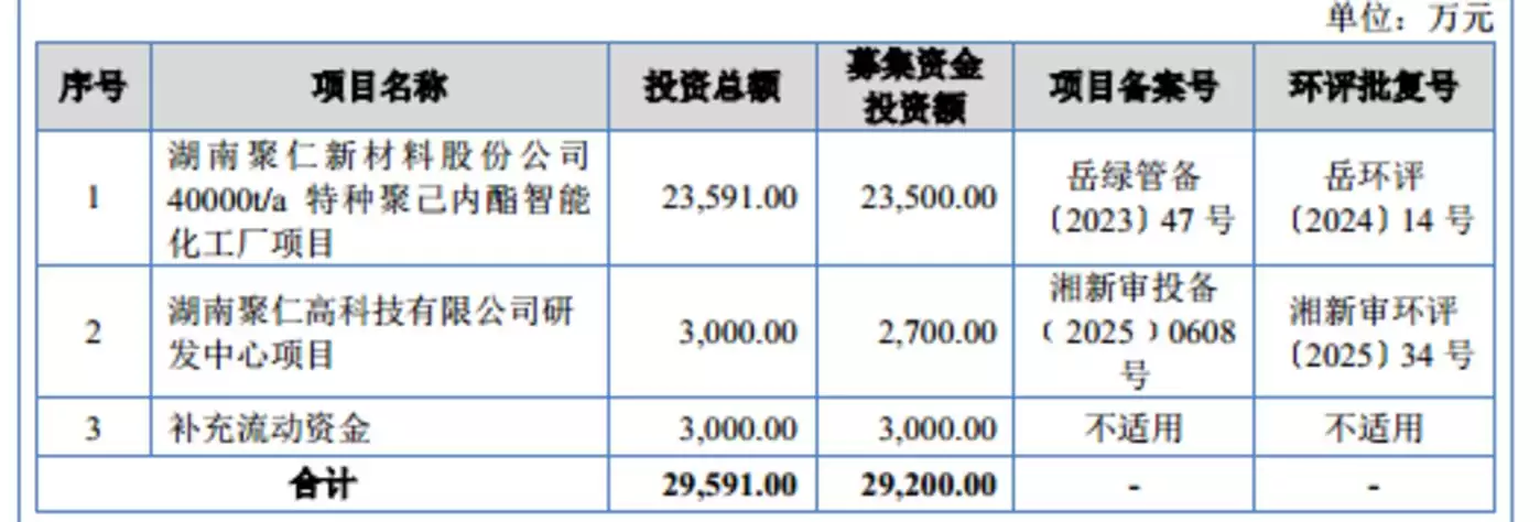 聚仁新材料此次北交所IPO拟募资2.92亿元分别用于湖南聚仁新材料股份有限公司40000t/a特种聚己内酰胺智能化工厂项目、湖南聚仁高科技研发中心项目、补充流动资金,具体情况如下: