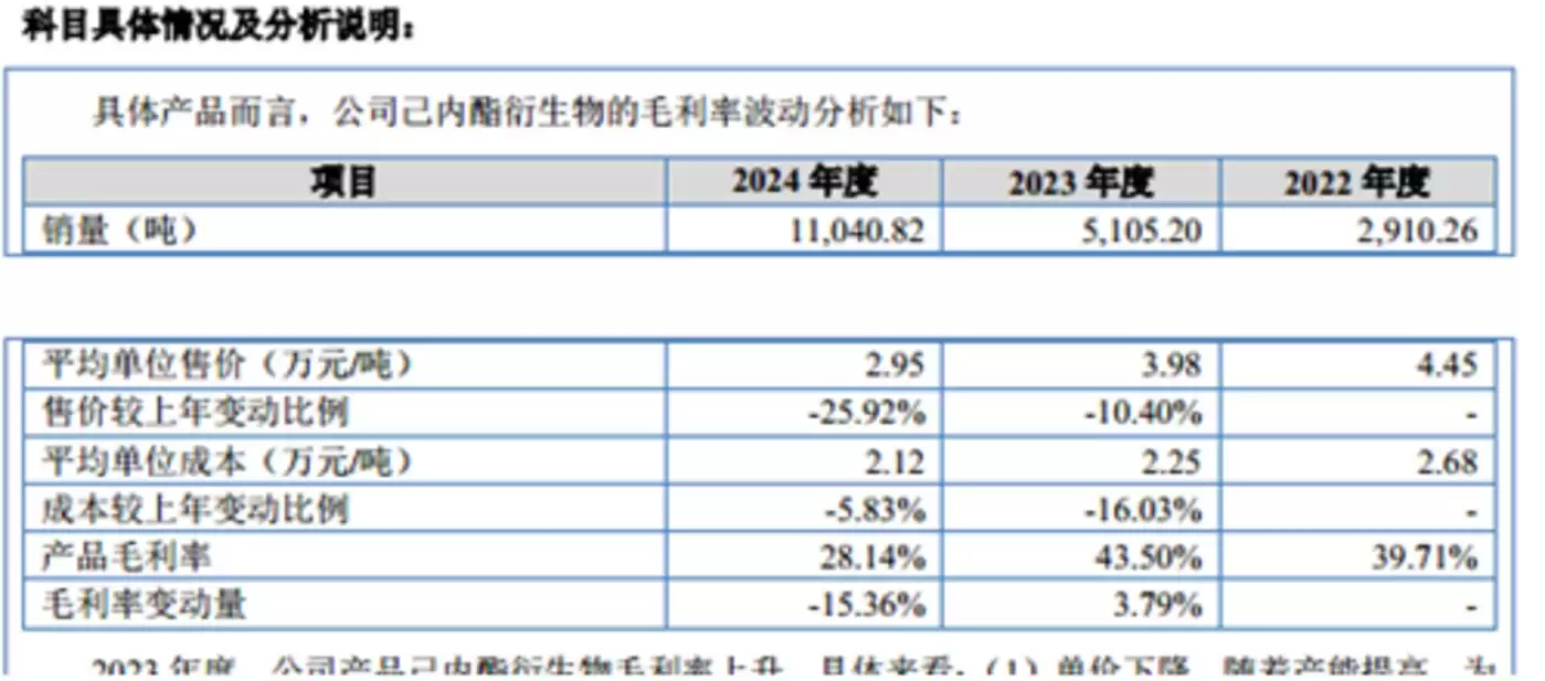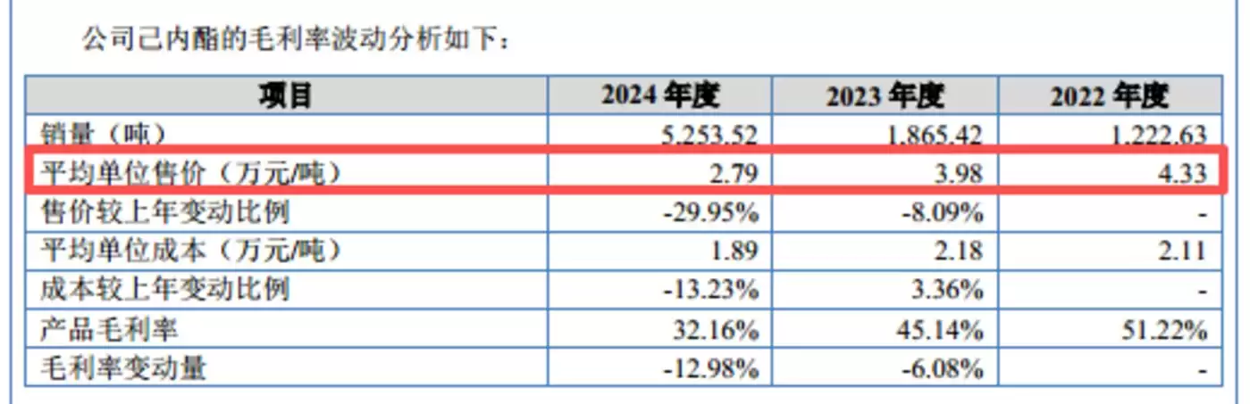 报告期内聚仁新材料两大核心产品的平均单位售价均呈现持续下滑趋势,且降幅较为明显。作为公司第一大业务的己内酰胺衍生物,2022年至2024年平均单位售价分别为4.45万元/吨、3.98万元/吨、2.95万元/吨,其中2024年单价较2022年累计下滑33.71%,三年间价格缩水超三成;而作为第二大业务的己内酰胺,同期平均单位售价同样持续下降,从2022年的4.33万元/吨降至2023年的3.98万元/吨,2024年进一步跌至2.79万元/吨。