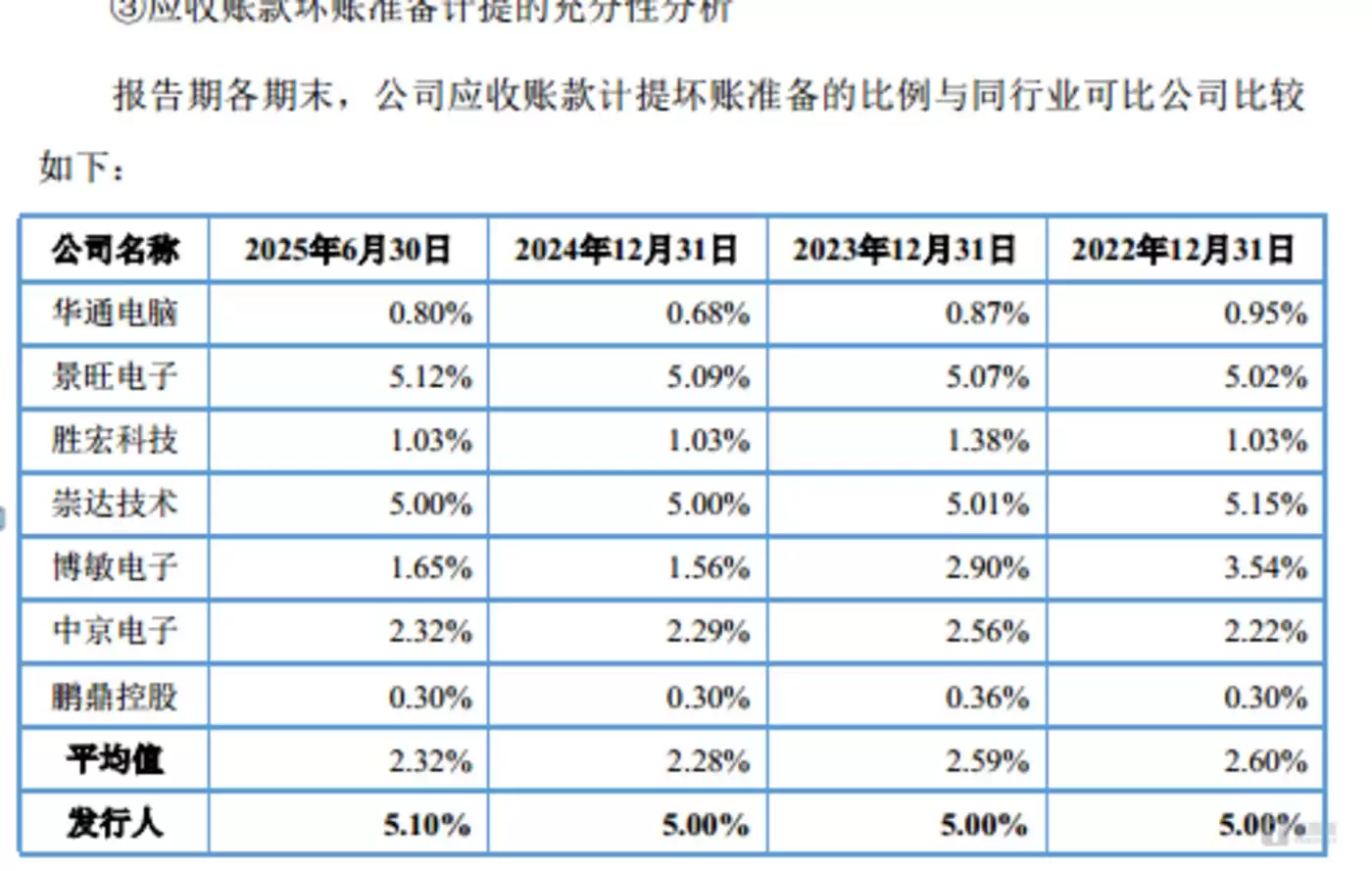 应收账款方面,红板科技的应收账款规模也在持续扩大,从6.22亿元增至11.36亿元,2024-2024年年均复合增速达21.55%,这一增速明显高于同期10.72%的营收增长。但在应收账款管理上,公司的表述与实际计提政策存在明显矛盾:一方面,公司账龄1年以内的应收账款占比极高,且历史数据显示此类款项基本能在次年完成兑付,回收情况良好,意味着应收账款实际风险较低;另一方面,公司始终按5%-5.1%的比例计提坏账准备,这一比例远超同行业2.28%-2.6%的平均水平。在回收风险已被证实较低的背景下,仍采用远高于行业常规的计提比例,其坏账计提政策的合理性,目前尚缺乏明确且有说服力的解释。
