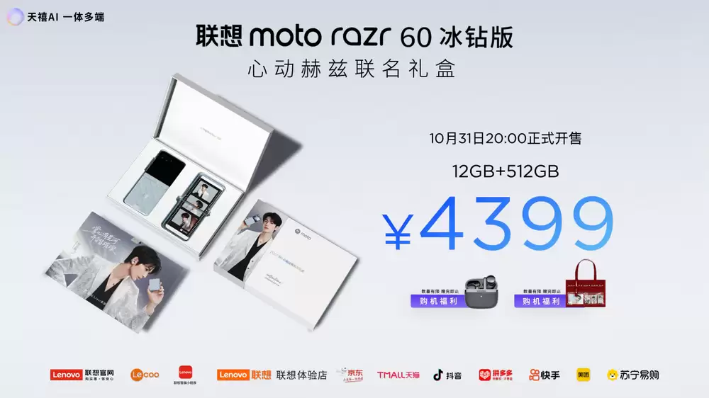 联想moto razr 60心动赫兹联名礼盒售价4399元,购买礼盒的用户即有机会获得“赫你相遇”限定礼袋,礼袋含张凌赫独家写真透卡、定制款痛包,以及丰沛的限定周边。