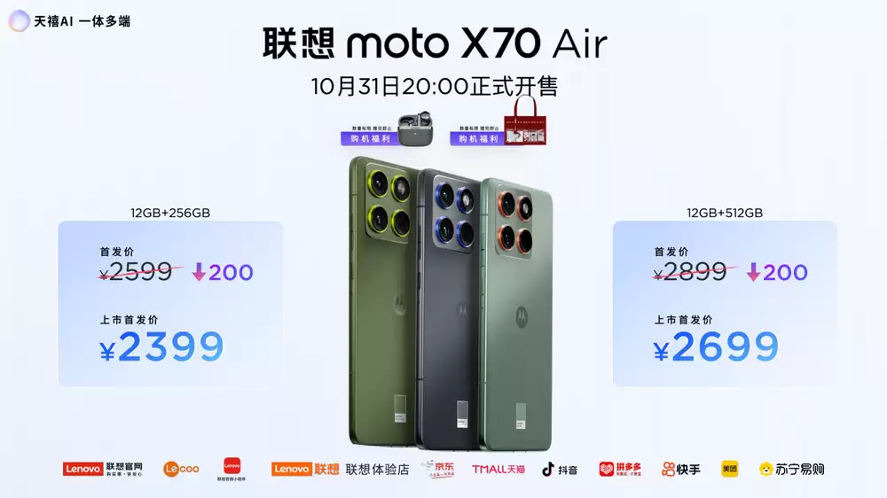 联想moto X70 Air AI手机售价2599元起,将于10月31日晚8时全渠道正式开售,首销福利限时优惠仅2399元起,还可享国补和平台补贴等多重优惠。