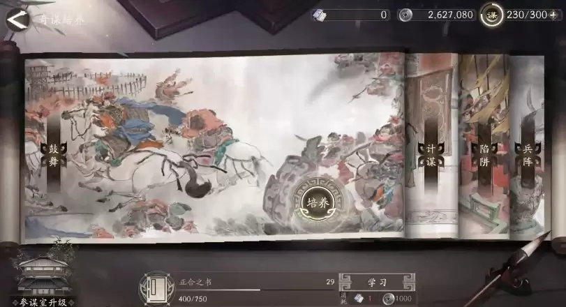 参谋室是研习奇谋的关键场所,这里汇聚了鼓舞、计谋、陷阱、兵阵四大类奇策。在实际作战中,这四类技能都发挥着不可或缺的作用。在这里,玩家能够快速掌握这些技能的入门要领并进行系统学习。每次学习需要消耗一本奇书和1000银币。目前游戏中收录的奇谋超过百种,从声东击西的"哗变之策"到出其不意的"伏兵之策",再到提振士气的"一鼓作气"和威力惊人的"猛火计",玩家都能逐一研习。