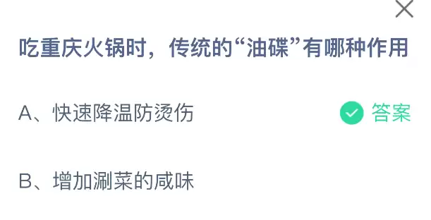 品尝重庆火锅时,那个传统的小料“油碟”到底有什么妙用呢?支付宝小鸡课堂开课啦!每天花一分钟参与答题赚饲料,喂养小鸡就能轻松献爱心!既简单又有意义的日常小活动!2025年11月1日蚂蚁庄园的题目正确答案是【快速降温防烫伤】,油碟能够有效为火锅中的高温食材降温,让食物入口时更加适宜,同时保护口腔不被烫伤。