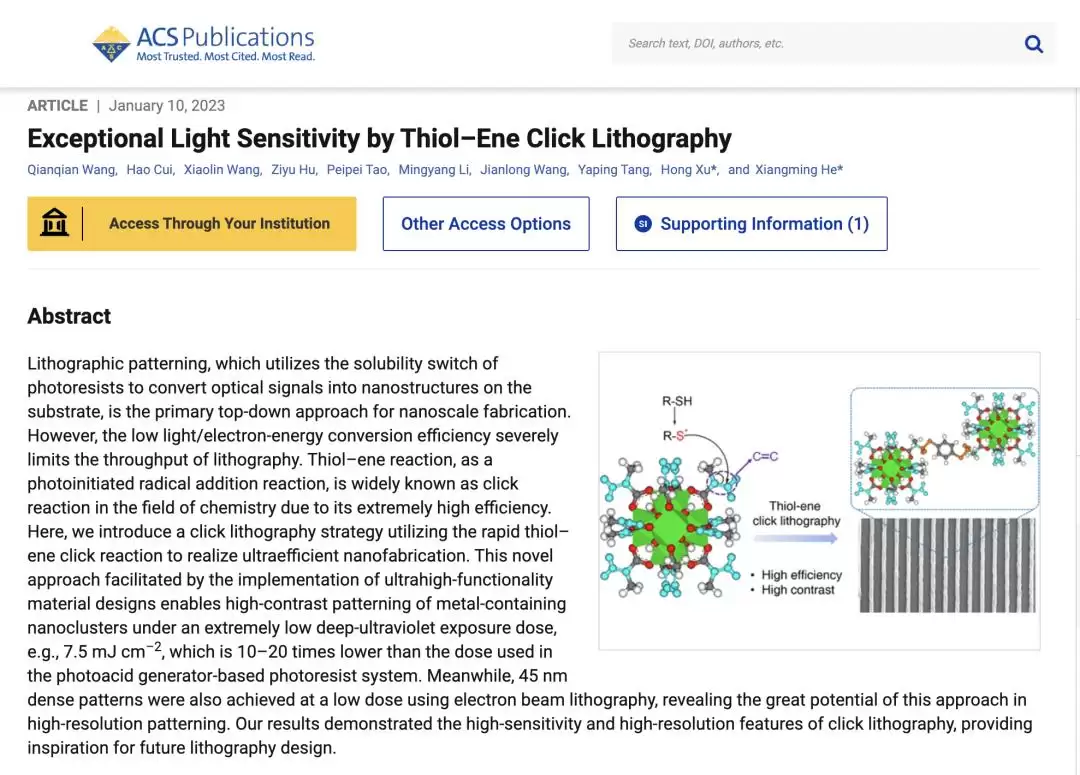 去年10月,我国清华大学与浙江大学的联合团队全球首次提出了“点击光刻”新方法,并成功开发出与之匹配的超高感光度光刻胶样品。