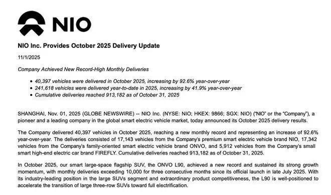 蔚来汽车今日公布了最新交付数据,以亮眼成绩刷新品牌纪录。2025年10月,公司单月汽车交付量突破4万辆大关,达到40,397辆,较去年同期大幅增长92.6%,创下月度交付量历史新高。这一数据不仅展现了品牌强劲的市场竞争力,也为新能源汽车行业注入了新的发展动能。