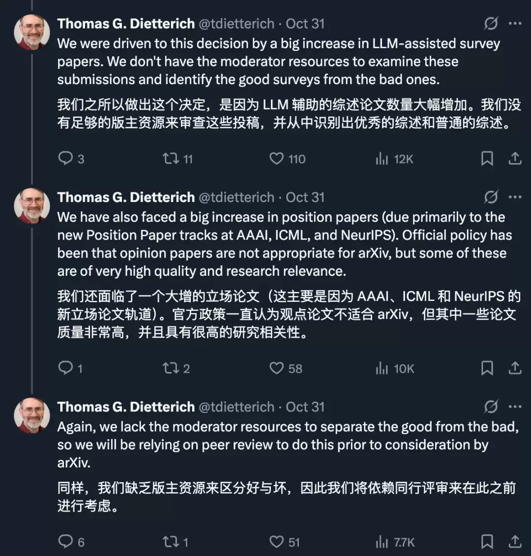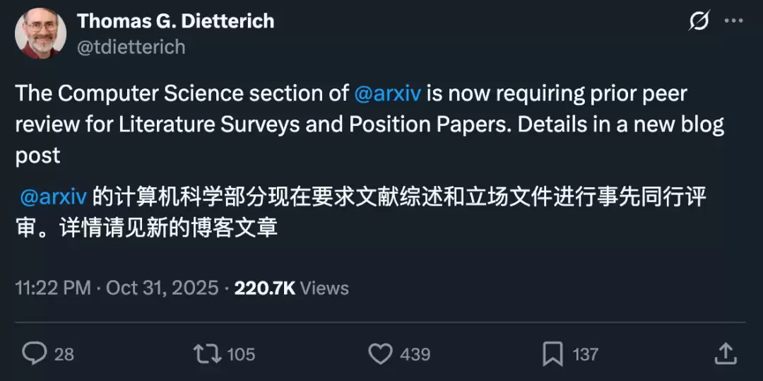arXiv 发布新规:综述、立场类论文不再随意收录,须经正式期刊或会议接收后方可发表