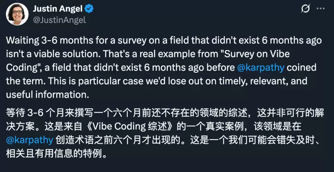 以「氛围编程」这样的新概念为例:一个六个月前还不存在的方向,非要等 3-6 个月走期刊/会议流程,才能挂上 arXiv,这会把最前沿、最时效的综述直接封杀。