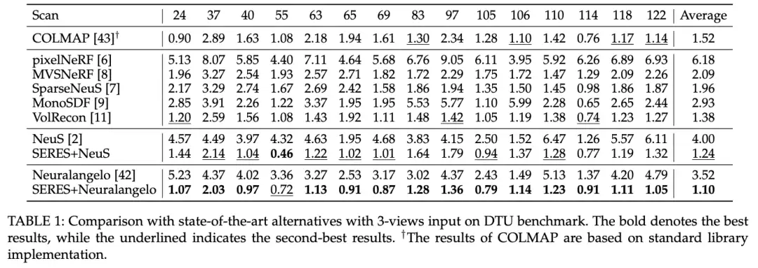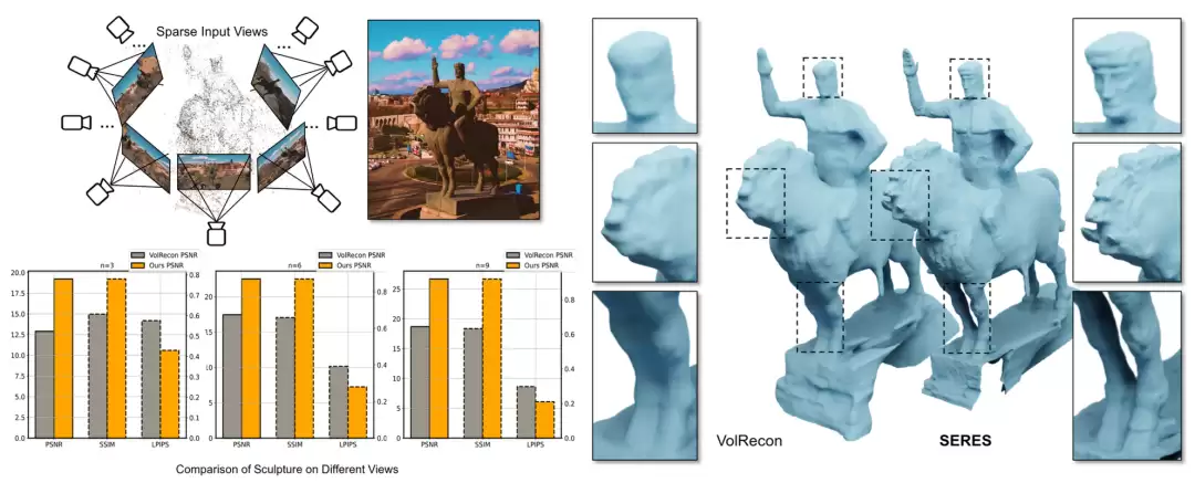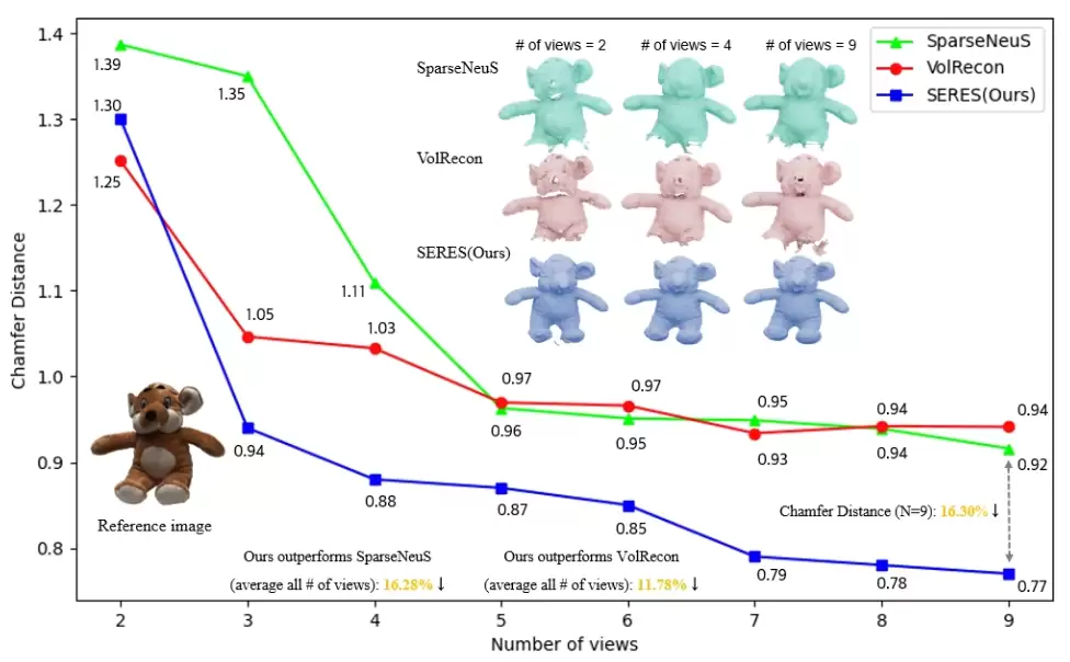 在DTU的稀疏多视角设置中,SERES作为训练期插件显著提升了重建质量与新视角合成质量。与主流基线相比,画面质量指标在多组场景中全面优于对应的原始主干,同时几何误差在从极少数到较少视角的范围内稳定下降。随着视角数从极少逐步增加,误差的下降趋势依旧保持,说明这套先验与正则对不同稀疏程度都有稳定收益。