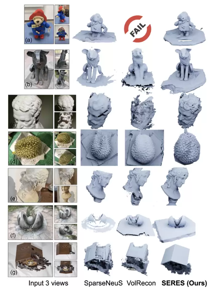 表面重建的核心挑战,在于如何在少量视角下同时兼顾几何准确性、细节还原与结构完整。现有神经隐式表达在样本稀疏时容易出现跨视角对应不稳、边界模糊、局部缺失等现象;当可见区域有限、纹理不明显、遮挡复杂时,这些问题会被进一步放大。