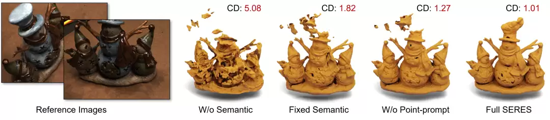 仅有像素级误差往往不足以约束形状的全局一致性,尤其在纹理稀薄或反射复杂的区域,像素级监督容易放大噪声。SERES在图像空间引入了解释性强的区域一致性约束。基于前述的几何原语,作者为每张图像得到一组覆盖关键部件的区域分割与掩码。在训练过程中,这些可解释的区域与模型渲染得到的语义分布进行对齐,形成面向区域的一致性约束。它鼓励模型在真实边界处给出更清晰、稳定的表面表达,在容易产生歧义的部分尽量减少破碎或漂移。与仅依赖像素损失不同,区域级正则提供了“形状应该如何对齐”的强信号,能有效抑制噪声碎片,让最终的网格更干净、曲面更连贯。