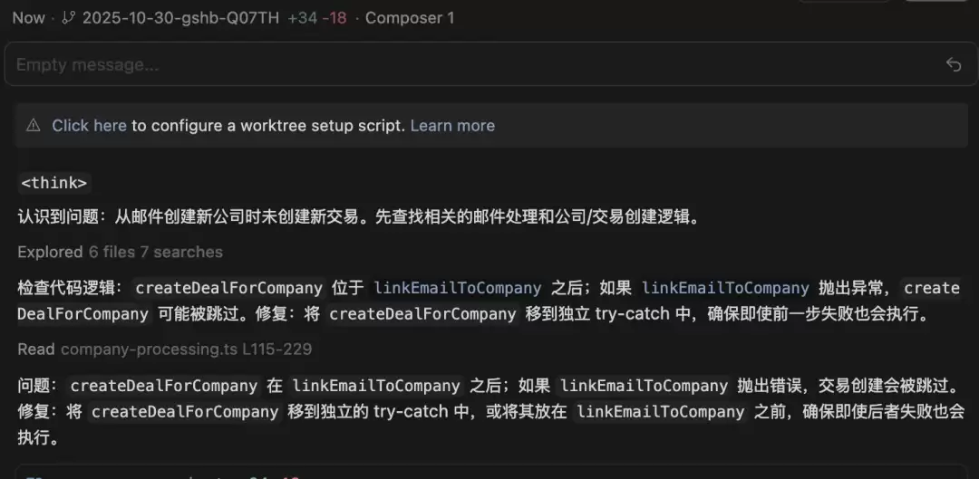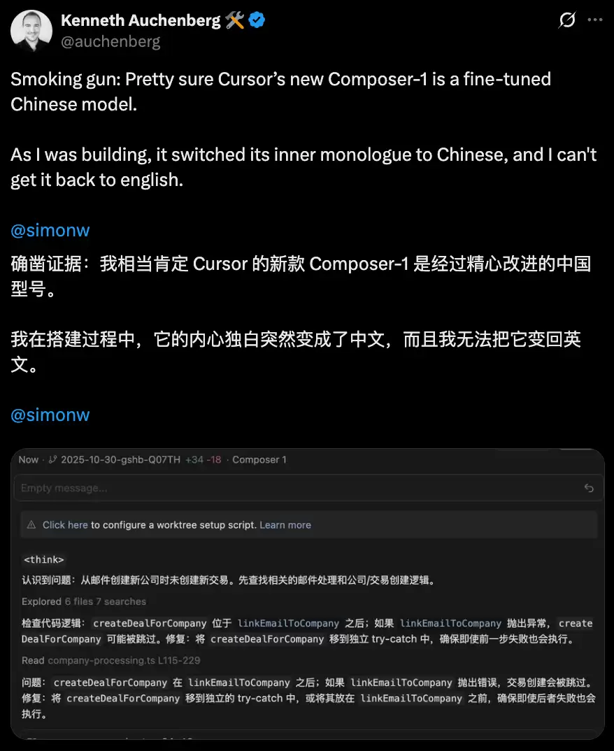 有细心网友发现,Cursor的Composer-1在运行过程中,会突然开始使用中文进行交流。