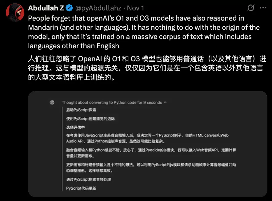此言并非空穴来风,Cursor这个新模型被用户发现,会在推理过程中不自觉地切换为中文: