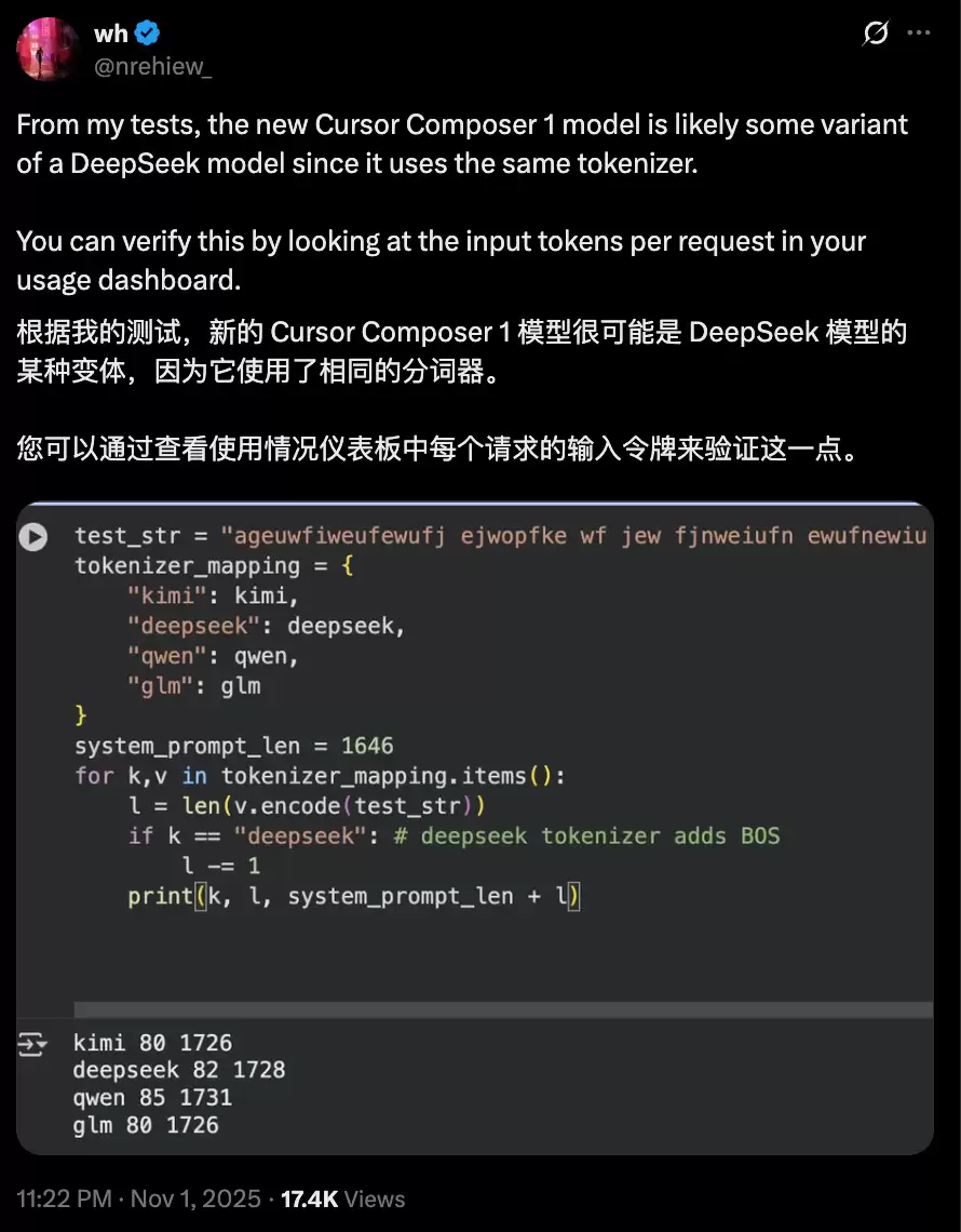 还有网友发现,Cursor Composer-1和DeepSeek使用的是相同的分词器。