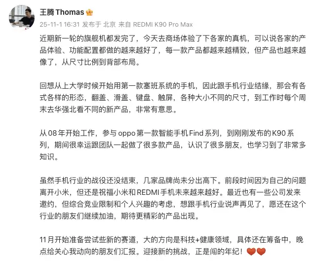 曾执掌小米中国区市场部的王腾,近日在个人社交账号上透露了职业生涯的最新动向。这位在手机行业深耕多年的资深从业者正式宣布,将结束与手机领域的长期合作,转而投身全新赛道。