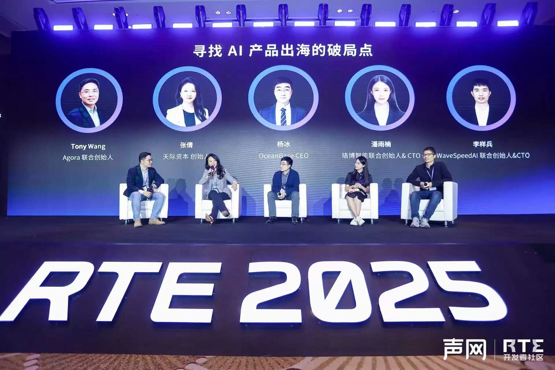 在圆桌对话环节,声网联合创始人Tony Wang与天际资本创始人张倩、OceanBase CEO杨冰、珞博智能联合创始人潘雨楠、WaveSpeedAI联合创始人李样兵围绕 AI 出海的核心挑战展开深度探讨,从赛道选择、竞争策略到落地执行等多维度探寻破局之道。