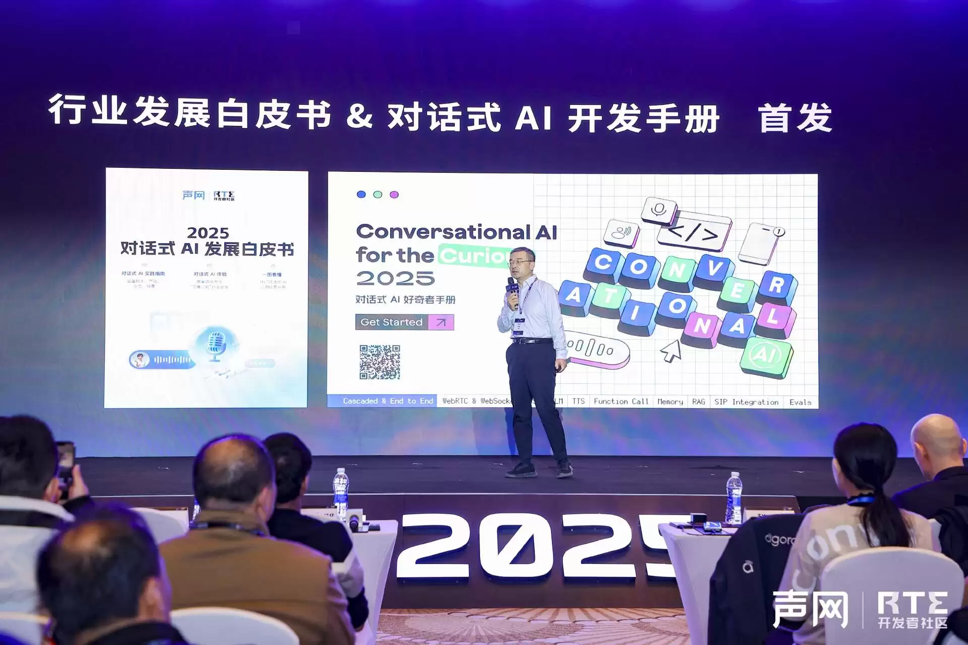 为帮助企业和开发者把握这一历史机遇,声网在大会上正式发布了《2025对话式AI发展白皮书》及《对话式 AI 好奇者手册 》,为行业提供了一套系统的实践指南。同时,声网推出了对话式AI引擎2.0,对话式 AI 开发套件、对话式AI模型评测平台和对话式AI Studio,加速对话式AI在实时互动行业的应用创新,开启RTE+AI的新篇章。