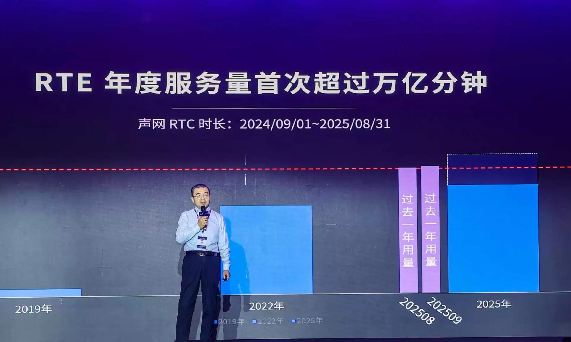 在今年的 RTE 2025 实时互联网大会开场演讲中,声网创始人兼 CEO 赵斌宣布,声网年度服务分钟数首次突破1万亿分钟,标志着 RTE 技术已成为不可或缺的关键基础设施。与此同时,视频高清化比例在过去两年增长超过10倍,海外市场720p以上分辨率流量占比已超80%,WebRTC 全球搜索热度呈现爆发式增长,这一切标志着实时互动行业正迎来新一轮创新热潮。