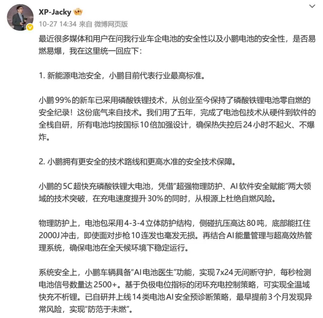 所以在这次MEGA起火之后,很多企业也公开回应了做电池方案的思路以及安全问题。比如小鹏动力总成高级总监顾捷就在微博表态,小鹏99%的新车都用磷酸铁锂电池,加上额外的安全补充措施,创业至今“零自燃”。