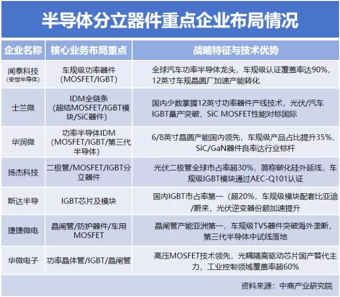 所谓功率器件,是安世半导体所在的分立器件的一个分支。目前,在功率器件领域,中国已形成了几支主力军企业,如比亚迪半导体、士兰微、斯达半导体等。