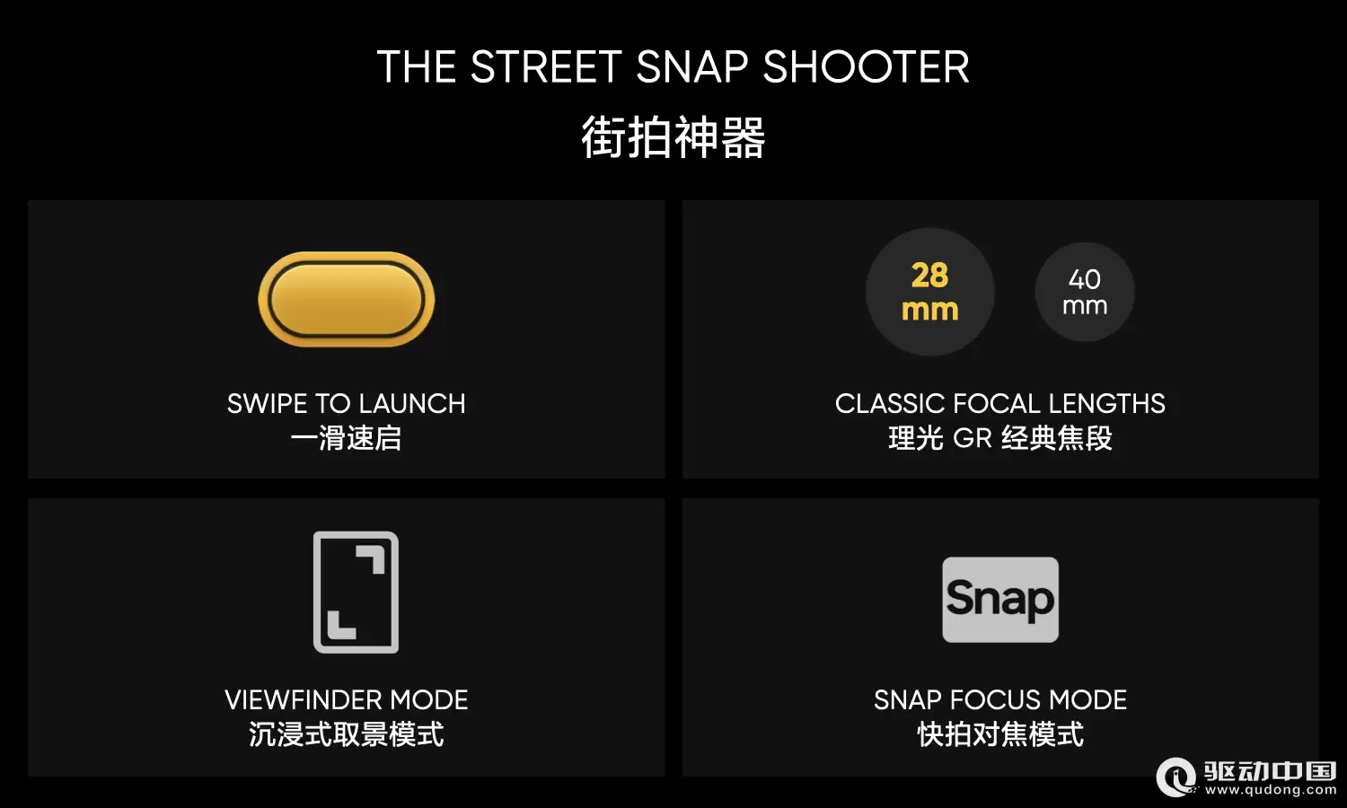 作为“街拍神器”,真我GT8 Pro的理光GR模式完美继承了理光GR的理念与美学。用户只需在相机界面“一划速启”快速切换至该模式,不仅和理光GR相机一样可以极速启动,同时还保留了相同的标志性快門声。依靠全新自研SuperQPD抓拍算法,真我GT8 Pro的快拍对焦模式从底层复刻了理光GR经典的超焦距和预设对焦功能。当灵感来临时,用户只需专注构图,无需等待对焦。