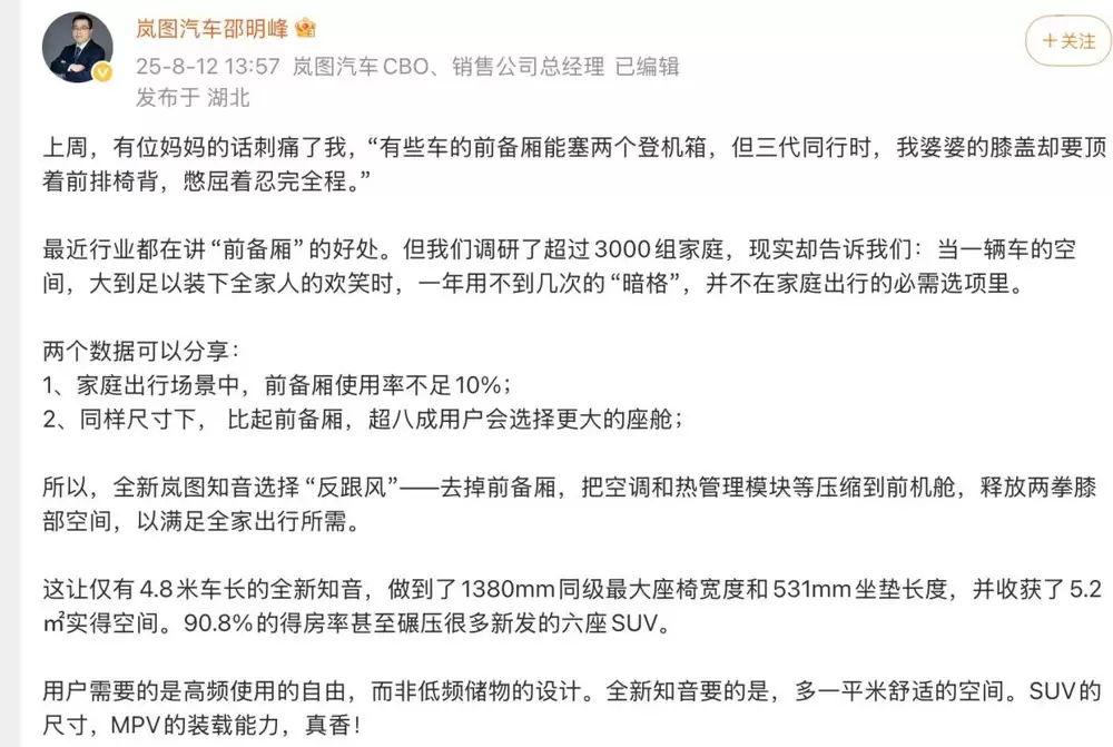 岚图汽车CBO、销售公司总经理邵明锋8月12日在其微博明确表示,调研了超过3000组家庭,有两个数据可以分享:一是在家庭出行场景中,前备厢使用率不足10%;二是在同样尺寸下,超八成用户会选择更大的座舱空间。