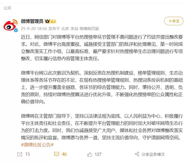 今年9月,国家网信办指导多地网信部门,对微博、快手、小红书、今日头条等多家平台进行约谈,责令限期整改热搜热榜存在的问题。通报指出,微博平台存在未落实信息内容管理主体责任,在热搜榜单主榜高位呈现大量炒作明星个人动态和琐事类词条等不良信息内容、破坏网络生态的问题。