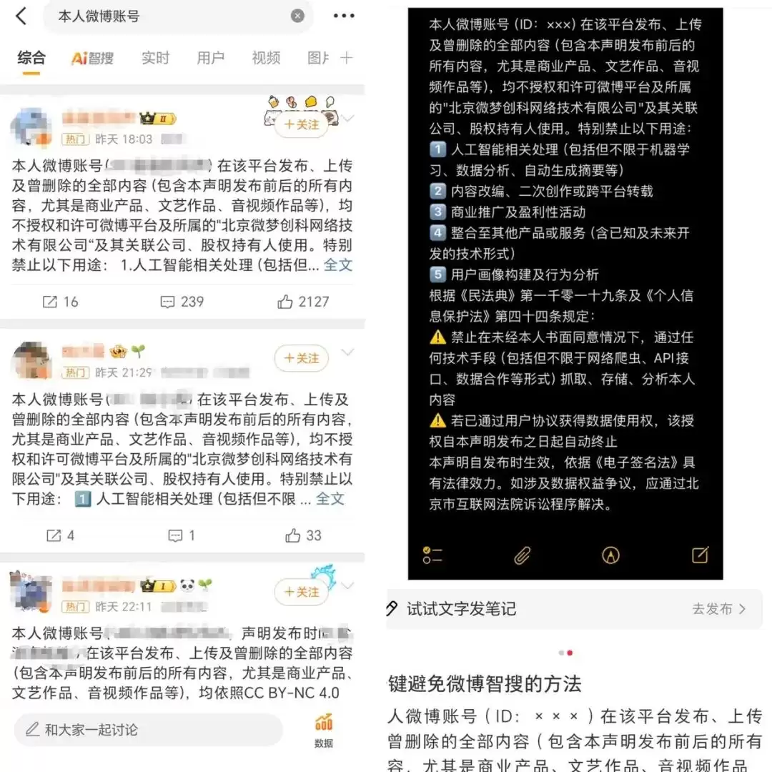 不少用户自发发起“拒绝 AI抓取声明”,声称自己账号的所有内容均不授权微博用于AI。