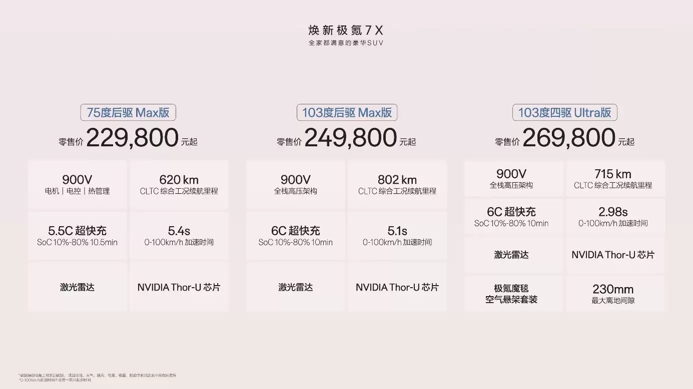 让全家都心满意足的豪华SUV——全新极氪7X正式登陆市场,带来了三款配置车型,包括75度后驱Max版、103度后驱Max版和103度四驱Ultra版,官方指导价分别为22.98万元、24.98万元和26.98万元。在超级置换权益的加持下,限时优惠价调整为21.98万元、23.98万元和25.98万元,为家庭用户提供了更具吸引力的选择。