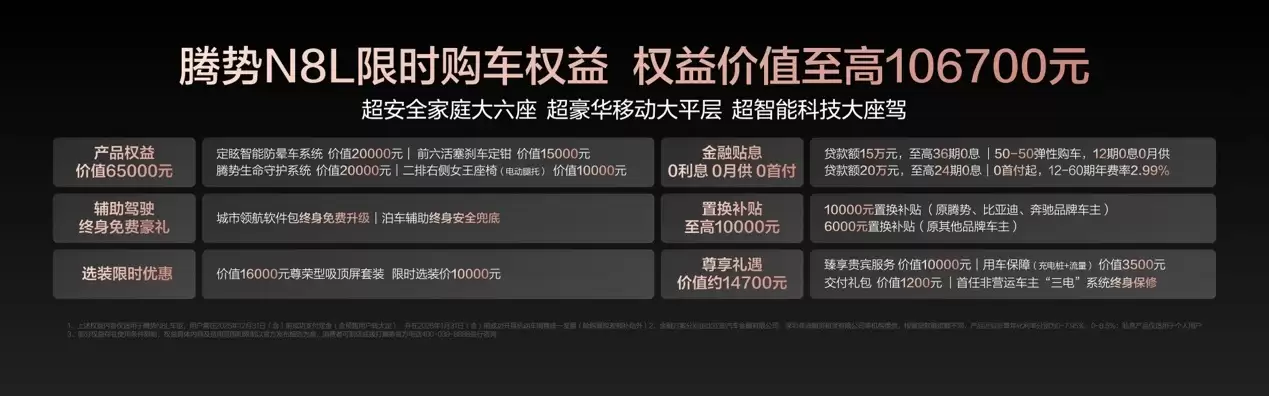 在产品定价策略上,腾势N8L展现出技术普惠的诚意。易三方底盘架构、云辇-A悬架、天神之眼激光版等核心配置均实现全系标配,彻底打破“高配才有好体验”的行业潜规则。配合价值10.67万元的限时权益,包括三年免息金融方案、最高1万元置换补贴,以及针对延迟交付用户的购置税差额补偿,进一步降低了家庭用户的购车门槛。